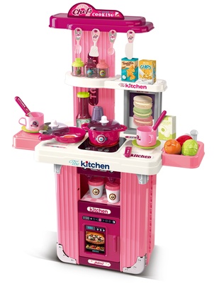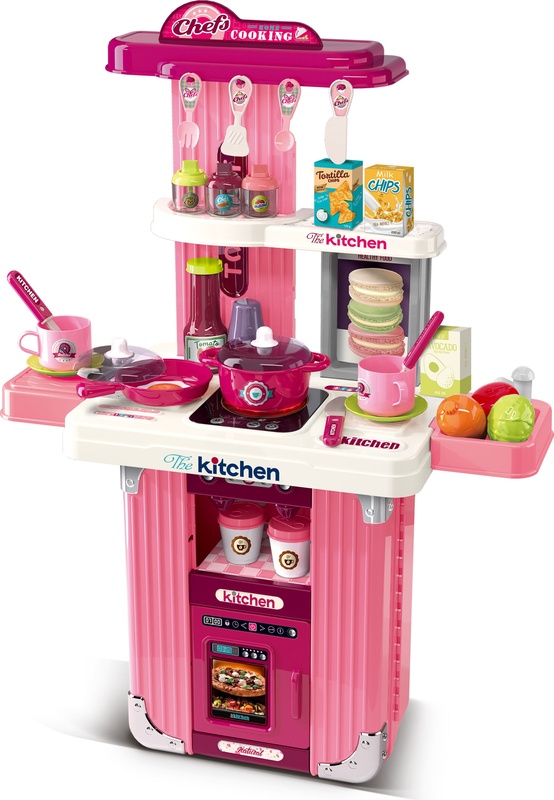 Bellissima cucina rosa in un pratico design 2 in 1, che i bambini possono portare ovunque! Una volta chiusa, si trasforma in una moderna valigia da viaggio con ruote, e una volta aperta, diventa una cucina completa con tutti gli accessori necessari per cucinare, cuocere e servire. Scelta ideale per piccoli cuochi e cuoche.