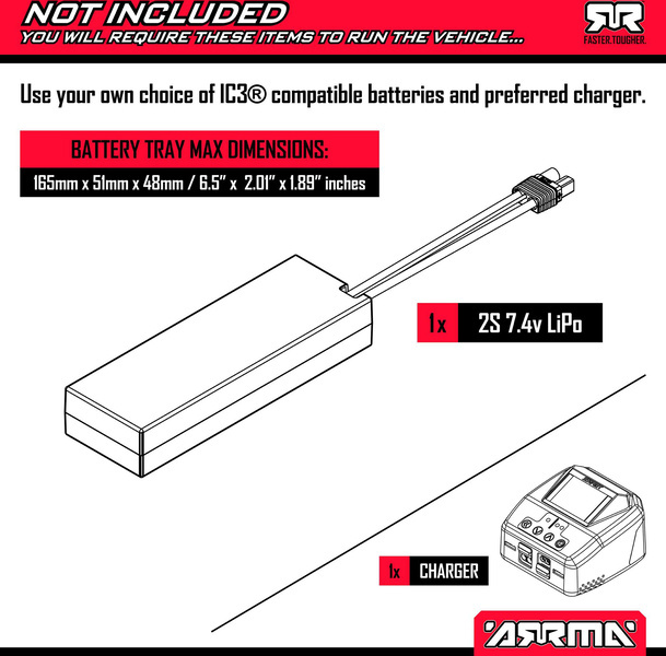 - Per un tempo di guida più lungo, batteria LiPo Spektrum 7.4 V 5000 mAh con tecnologia Smart, oppure Spektrum G2 7.4 V 5000 mAh con tecnologia Smart G2.