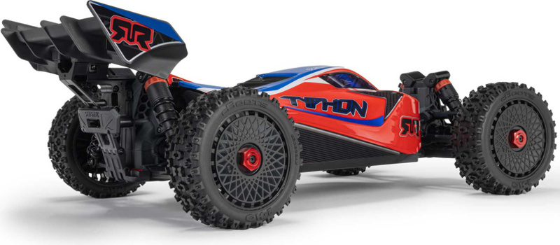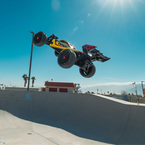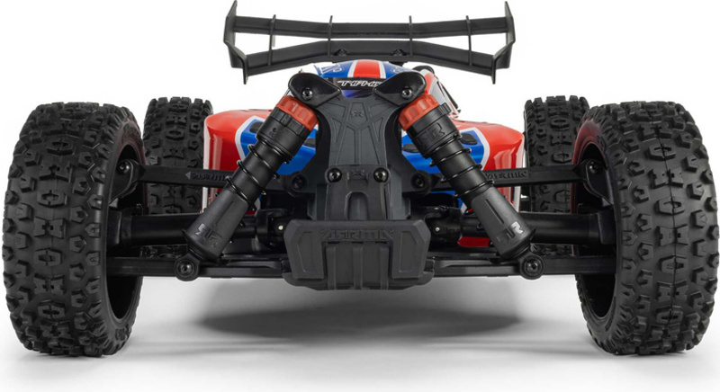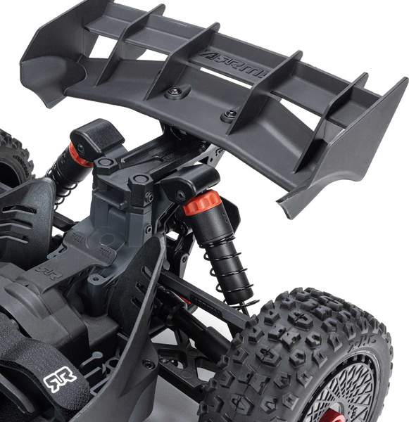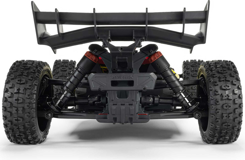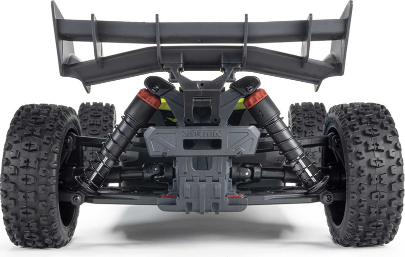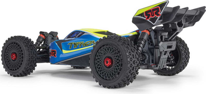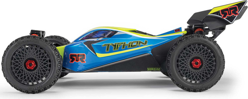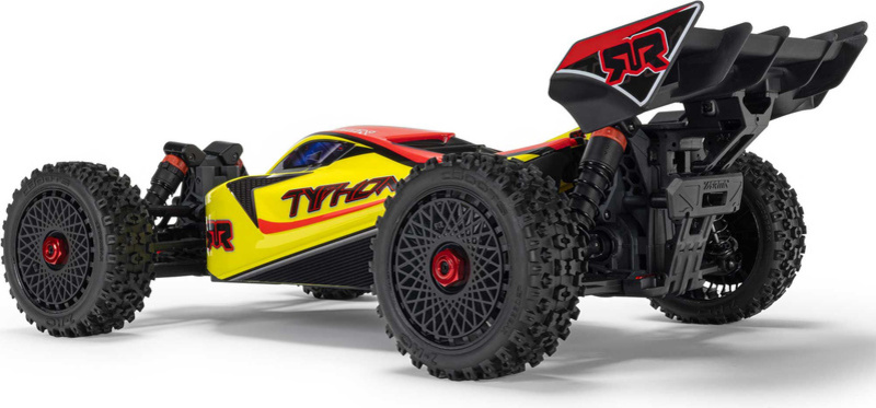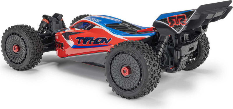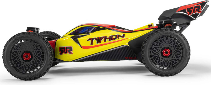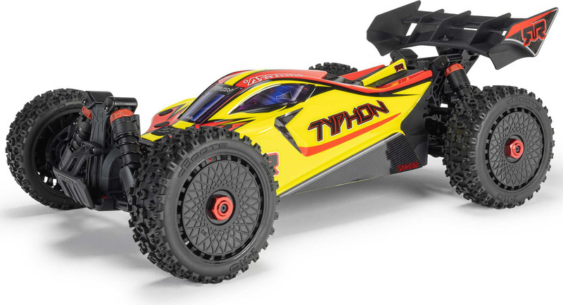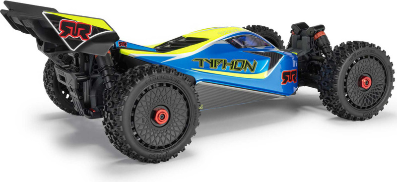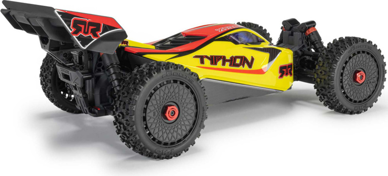 Il modello RC buggy Arrma Typhon Mega in scala 1:8 con trazione 4x4, ideale per bambini e principianti, offre potenza extra immediatamente dopo l'apertura, grazie a un motore a corrente continua 665 (High Speed) più grande del 11%. Raggiunge velocità fino a 32 km/h. Telaio resistente con piastre scorrevoli e sponde rialzate per proteggere da sporco e detriti. Differenziali robusti con ingranaggi in metallo. Ammortizzatori ad olio. Carrozzeria senza giunti per una facile sostituzione della batteria. Set RC Spektrum SLT2.