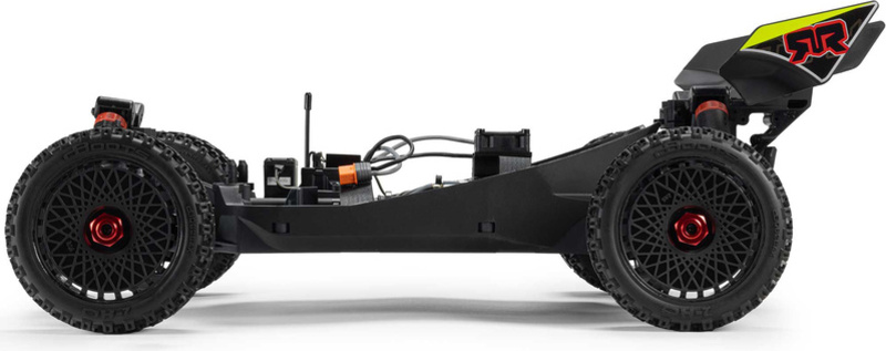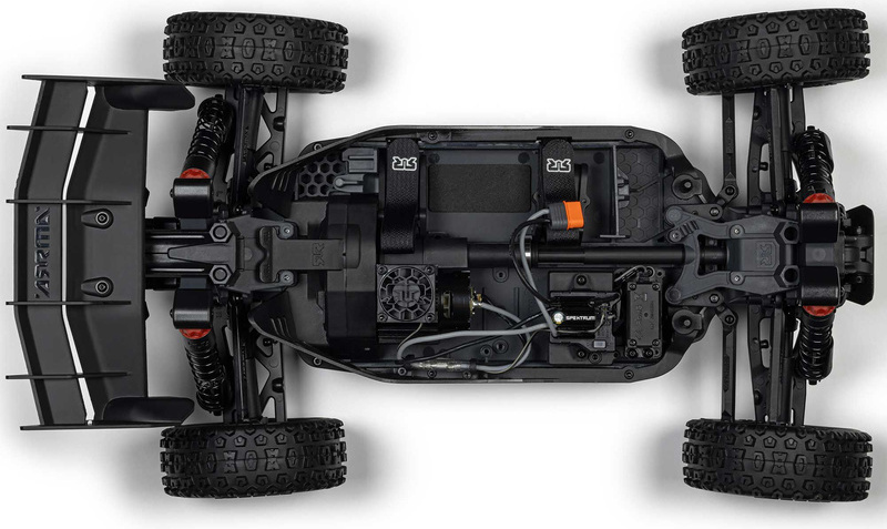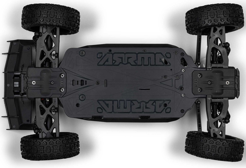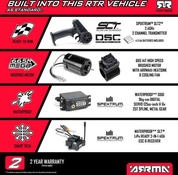 La carrozzeria è già verniciata e utilizza un sistema di fissaggio senza giunti per una facile sostituzione della batteria e accesso all'elettronica. Il modello è dotato di un'unità di controllo Spektrum 2 in 1 con regolatore integrato e ricevitore. È possibile impostare facilmente il tipo di batteria sull'unità utilizzando un jumper. L'unità include anche una porta per il collegamento di un ricevitore esterno. Il grande motore 665 include ora un radiatore in alluminio con ventola da 35 mm per mantenere una temperatura operativa adeguata in tutte le circostanze. Basta aggiungere una batteria e un caricabatterie (venduti separatamente), poi puoi partire con il tuo ARRMA TYPHON MEGA 665 4x4 nel giardino, nel terreno o sull'erba bassa e goderti la guida.