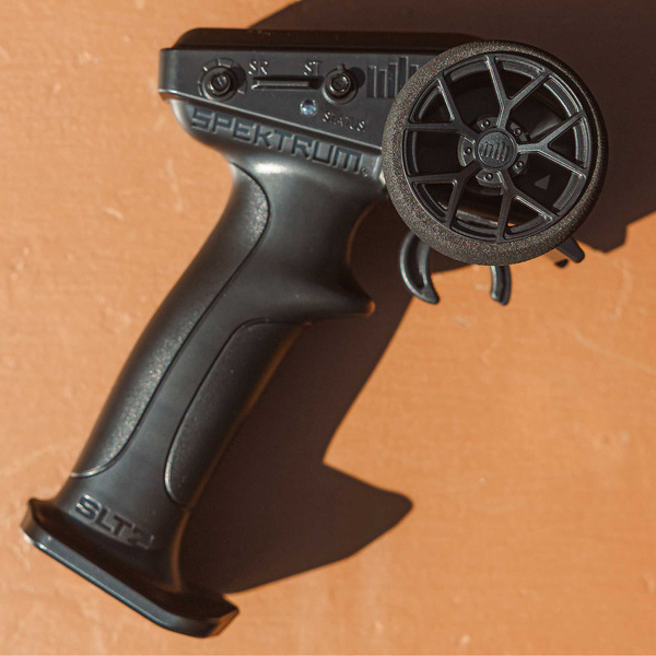 Il trasmettitore a 2 canali Spektrum SLT2 ha una dimensione ideale per tutti i conducenti. Può aiutarti a imparare a controllare il modello in sicurezza limitando la velocità massima del modello al 50% o 75%, fino a quando non sei pronto per la piena potenza. Nella confezione sono incluse 4 batterie AA per il trasmettitore.