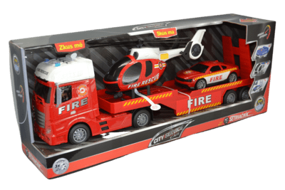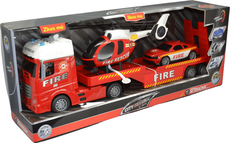 Presentazione della CITY SERVICE CAR - 1:12 Camion dei pompieri con elicottero e auto. Questo trattore in plastica di alta qualità è il giocattolo perfetto per ogni bambino che sogna di diventare un pompiere. L'autopompa è dotata di uno straordinario sistema di trasporto per un elicottero e un'auto, che la rende una fantastica aggiunta a qualsiasi collezione di giocattoli.