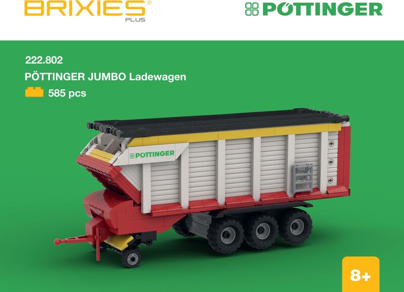 Scoprite il divertimento e la creatività con il set di costruzione 3D BRIXIES Pöttinger Jumbo – veicolo multifunzionale a raccolta automatica, 585 pezzi! Questo set di costruzione dettagliato contiene un totale di 585 pezzi, con cui non solo i bambini, ma anche gli adulti possono costruire il modello del veicolo multifunzionale a raccolta automatica Pöttinger Jumbo. Una volta assemblato, il modello raggiunge le dimensioni di: circa 31,4 x 13,1 x 9,6 cm (l x h x p). Questo set di costruzione è ispirato a una macchina reale, garantendo una fedele cattura dei suoi elementi caratteristici e del design unico. Di seguito troverete ulteriori informazioni interessanti e dettagli tecnici.