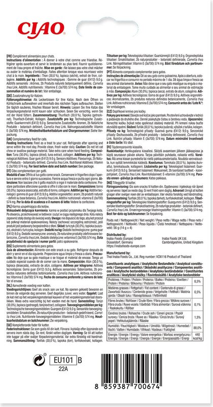 Pasta cremosa ad elevata appetibilità indicata come alimento complementare per gatti e gattini di età superiore ai 3 mesi. Questa pasta deliziosa e cremosa è più di un semplice piacere, è una scelta salutare che sostiene la salute e la vitalità generale del tuo gatto. Le leccate dell'Ontario sono ricche di nutrienti di cui il tuo gatto ha bisogno per una vita sana. Il componente chiave è la taurina , che contribuisce a mantenere cuore e vista sani . La taurina svolge anche un ruolo importante nella prevenzione di molte malattie gravi e favorisce lo sviluppo e la crescita sani del gatto. Inoltre, i leccati dell’Ontario sono anche ricchi di vitamine come la vitamina A, B2, B3, B5, D3 ed E, che aiutano a mantenere il gatto in buone condizioni. Il lecca-lecca Ontario è disponibile in una pratica confezione da cinque tubi da 14 g, che mantengono la pasta fresca e pronta da servire. Puoi dargli da mangiare direttamente dal tubo, su un tappetino da leccare o altri giocattoli interattivi, oppure usarlo per migliorare il sapore del cibo secco se il tuo gatto lo rifiuta. E qual è il migliore? La leccata è priva di coloranti e aromi artificiali, quindi puoi essere sicuro che il tuo gatto riceva solo il meglio. Gusto eccellente: I gatti adorano il suo gusto cremoso e delizioso. Salute e vitalità: Supporta la salute del cuore, della vista e della crescita e dello sviluppo generale del gatto grazie alla taurina e alle vitamine. Confezione pratica: 5 tubi da 14g ciascuno mantengono la pasta fresca e facile da somministrare. Consegna flessibile: Può essere somministrato direttamente dal tubo, su un tappetino da leccare o in altri giocattoli interattivi o utilizzato per migliorare il gusto del cibo secco. Ingredienti puri: Senza coloranti e aromi artificiali per un servizio sano e sicuro. Con Ontario Licks, puoi assicurarti che il tuo gatto riceva ciò di cui ha bisogno per una vita sana e felice. Istruzioni per l'alimentazione La dose consigliata è di 3-6 tubetti al giorno per un gatto di peso inferiore a 5 kg. Dopo l'apertura conservare in frigorifero e consumare entro 1 giorno. Composizione Acqua 60,256%, tonno 23,00%, pollo 6,70%, gamberetti 6,50%, amido di tapioca 2,90%, gomma xanthan 0,55%, taurina 0,09%, vitamine (A, B2, B3, B5, D3, E) 0,004%. Componenti analitici Proteina grezza 7%, grassi grezzi 0,1%, fibra grezza 0,5%, ceneri grezze 1%, umidità 88%. Integratori Taurina 900 mg, vitamine (A, B2, B3, B5, D3, E) 40 mg, gomma xantano 5500 mg. Confezione da 5 x 14 g