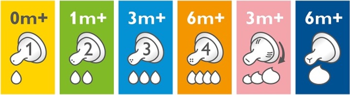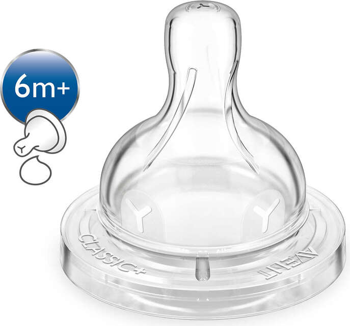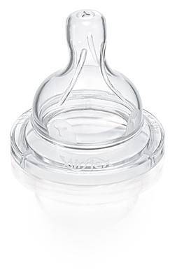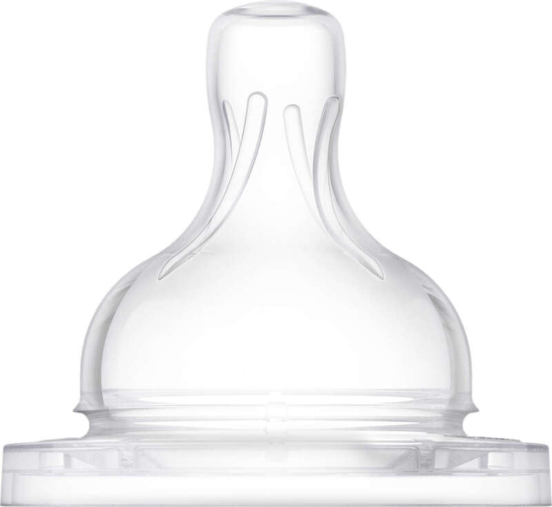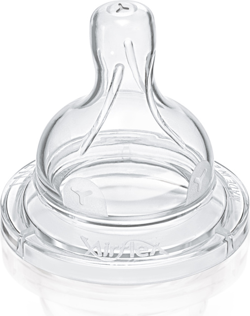 Il ciuccio in silicone AVENT ha un bordo brevettato unico che funge da valvola unidirezionale. Il ciuccio permette all'aria di fluire nel biberon durante la poppata, prevenendo così la formazione del vuoto nel biberon. Il bambino non deve lasciare il ciuccio durante l'allattamento e può bere continuamente come durante l'allattamento al seno senza inghiottire aria.