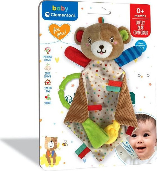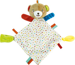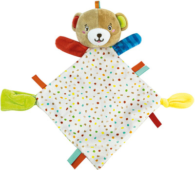 Un morbido orsetto di peluche che porti sempre con te, puoi sentire il profumo della tua mamma anche quando non c'è. Su un angolo della copertina è presente un pratico porta ciuccio. La mamma potrà “lasciare” il proprio profumo sul peluche, che accompagnerà il bambino per tutta la giornata e diventerà il suo perfetto compagno di lettino e di giochi. La scelta dei tessuti è frutto di un'attenta ricerca per garantire la massima qualità e sicurezza durante il gioco.