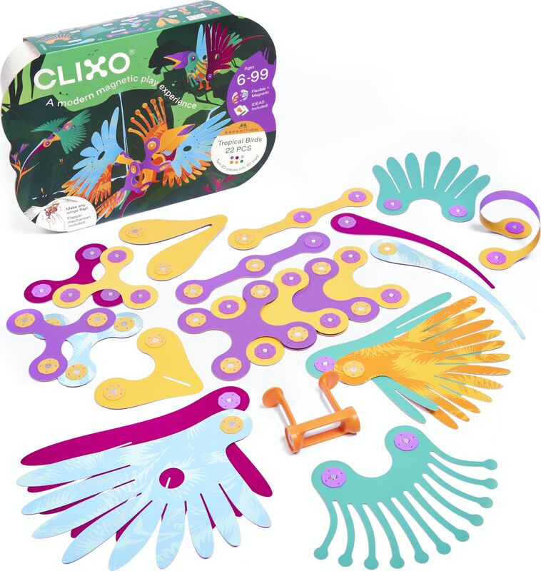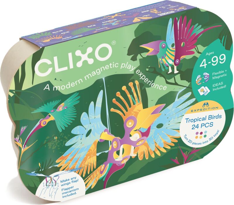 CLIXO Uccelli Tropicali - 22 pezzi è un gioco di costruzione magnetico tematico, flessibile e molto leggero, realizzato in carta sintetica, con colori vivaci combinati con una stampa astratta, progettato per creare uccelli tropicali o altri volatili. È ispirato all'origami, ma si basa sul principio di unione di diverse forme e pezzi tramite l'attrazione dei magneti.