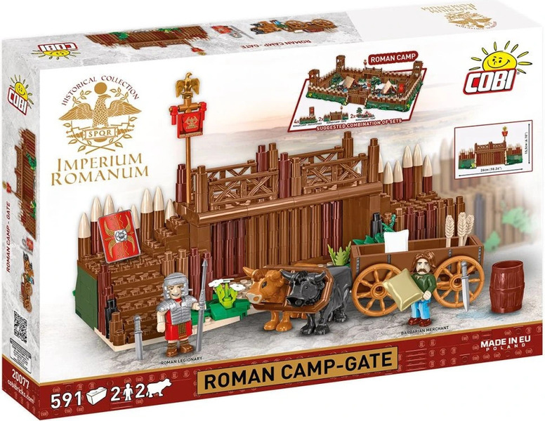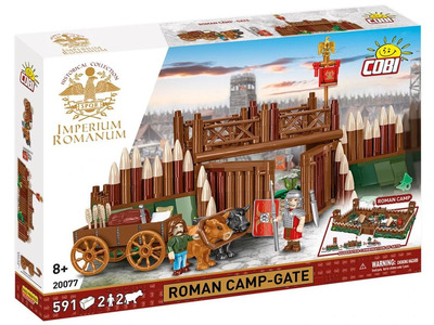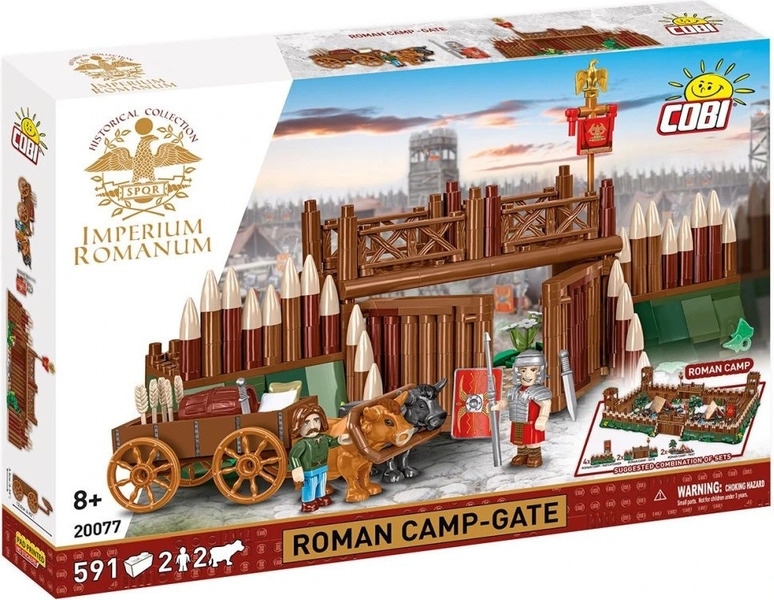 Il set "Campo Romano - Porta" è parte di un complesso modulare più grande della serie IMPERIUM ROMANUM di COBI. Combinalo con quattro torri di guardia (#20076), un'altra porta (#20077) e due tende di legionari (#20078). Costruisci una fortezza con la classica disposizione quadrata castrum, che corrisponde alla dottrina militare romana. Schiera pattuglie, pianifica campagne militari e gestisci le provviste – tutto in linea con la realtà delle antiche tattiche.