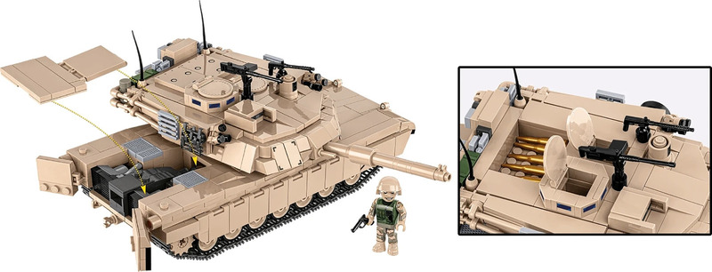 Elementi mobili – La torretta ruota di 360° e la canna del cannone può essere regolata in diverse angolazioni. Questo è ideale per ricreare dinamiche scene di battaglia, giocare e esporre in diorami storici. Il carro armato ha portelli apribili, portelli di servizio posteriori e un'armatura posteriore rimovibile che consente una vista panoramica del suo interno. Oltre al potente cannone da 120 mm, il modello ha due mitragliatrici mobili: M2 Browning e M240, che aumentano il realismo del modello.