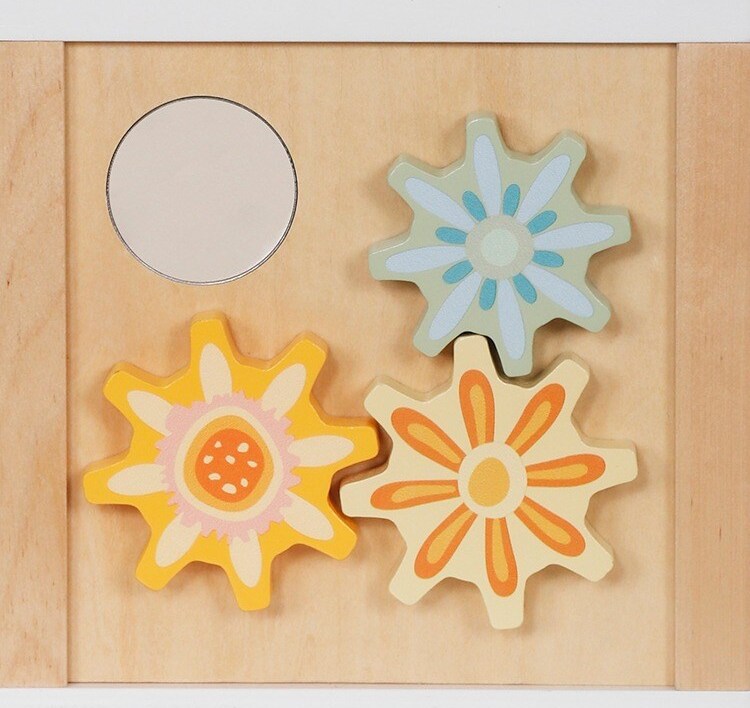 Cinque diverse attività motorie in un solo giocattolo: labirinto con perline, forme da infilare, ingranaggi, cubi divertenti con animali, specchio e elementi scorrevoli.