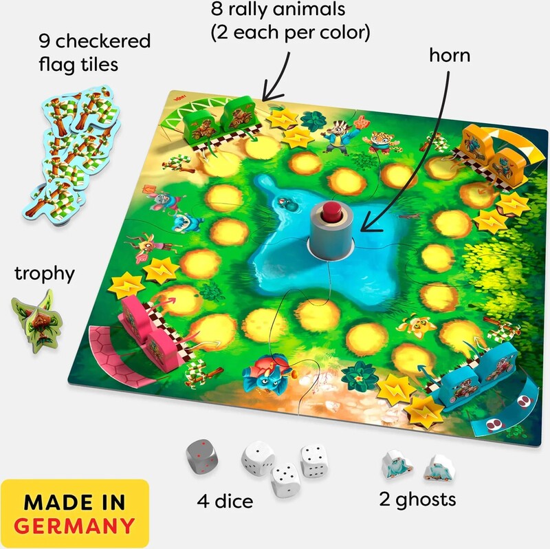 Gioco di corsa veloce con animali e auto per 2-4 giocatori dai 6 anni in su.