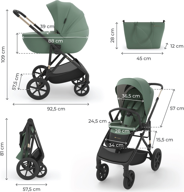 Nell'uso quotidiano, il PRIME 3 si distingue per la sua funzionalità: la chiusura con il seggiolino accelera i preparativi per l'uscita e facilita lo stoccaggio, e il sistema di pulsanti di memoria consente di rilasciare la navetta profonda o il seggiolino con una sola mano. La cappottina regolabile e il poggiapiedi facilitano l'adattamento del passeggino alle condizioni meteorologiche e alle esigenze del bambino durante la passeggiata. Il set include anche una borsa spaziosa e alla moda, che aggiunge al passeggino uno spazio pratico per accessori, snack e piccoli oggetti necessari durante i viaggi.
