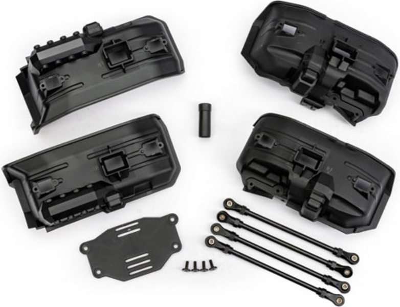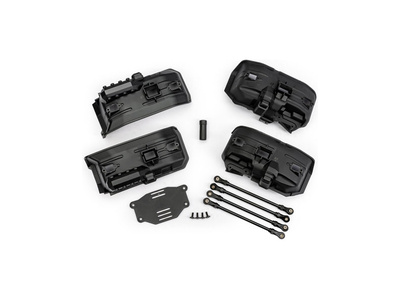 Kit di conversione per il telaio Traxxas TRX-4 che consente di ridurre il passo delle ruote da 324 mm a 312 mm. Destinato a un sistema di fissaggio della carrozzeria senza clip. Include barre di sospensione superiori e inferiori posteriori, parafanghi con sistema senza clip, parte esterna dell'albero cardanico, supporto della batteria modificato e materiale di fissaggio.