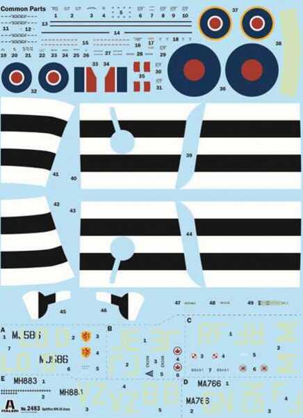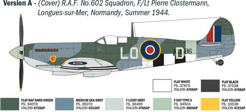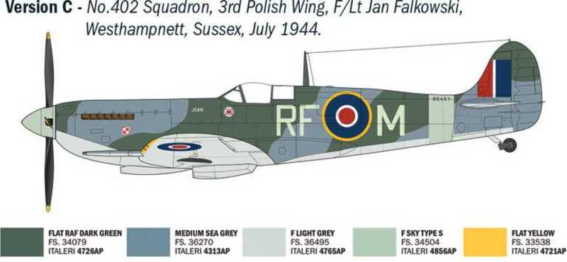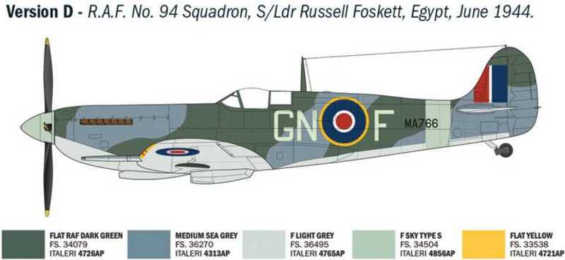 Modello di aereo da assemblare. Dimensione: 1:48; 20 cm. Difficoltà: 2.5 VERSIONI PER ASI RAF: F/Lt Pierre Clostermann, W/Cdr James E. Johnson, F/Lt Jan Falkowski, S/Ldr Russell Foskett, F/Lt George Beurling