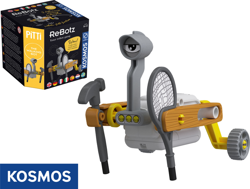 Assemblate facilmente due ruote, una racchetta da tennis, un martello e un motore seguendo le istruzioni. Pitti ha trovato tutti i suoi pezzi in un deposito di rottami, da dove provengono anche i suoi tre amici della gang robotica Rebotz.