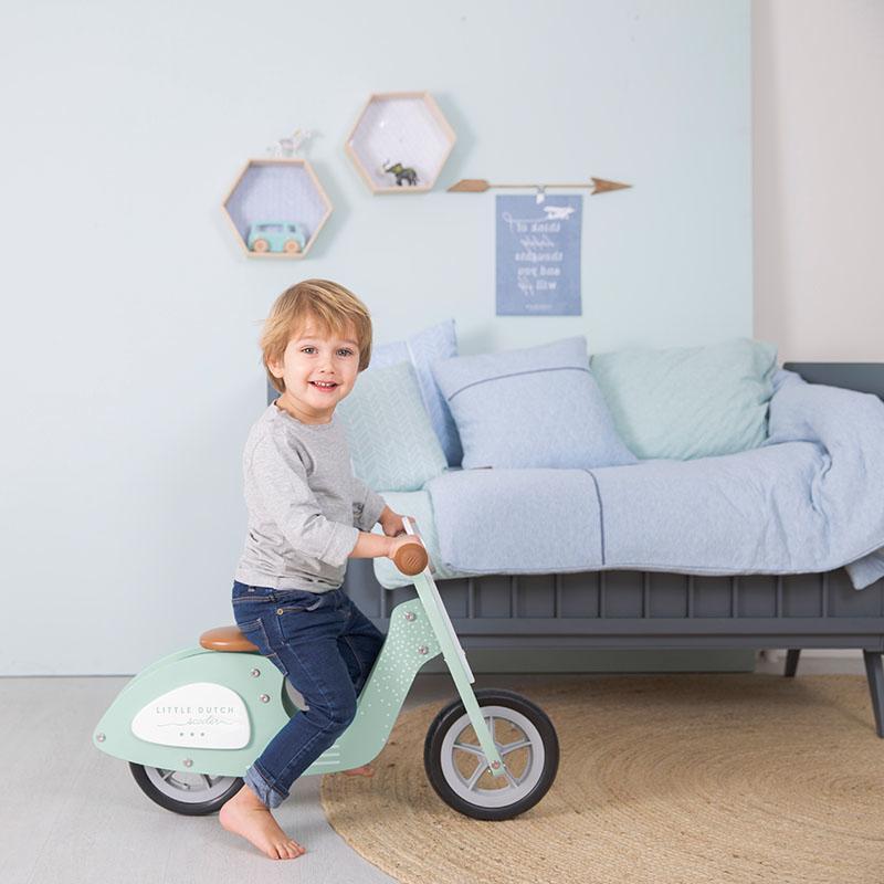 Allegro e robusto monopattino in legno Little Dutch, che stimola lo sviluppo dell'equilibrio e insegna al tuo bambino a guidare. Con sella morbida e manubrio in tinta marrone.
