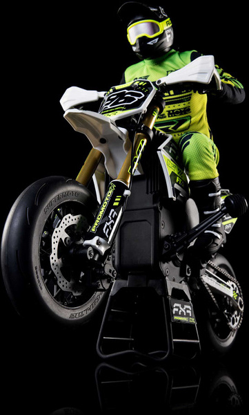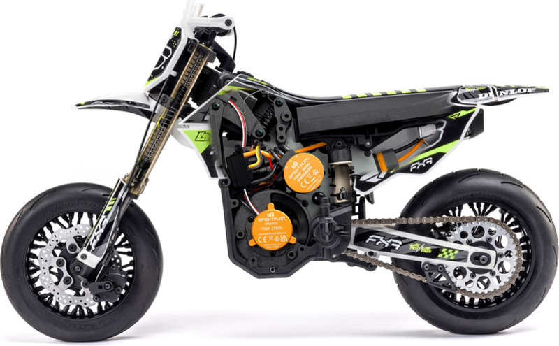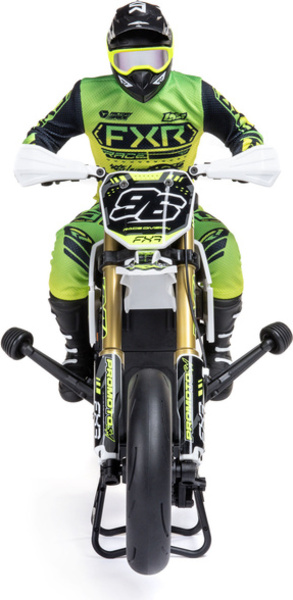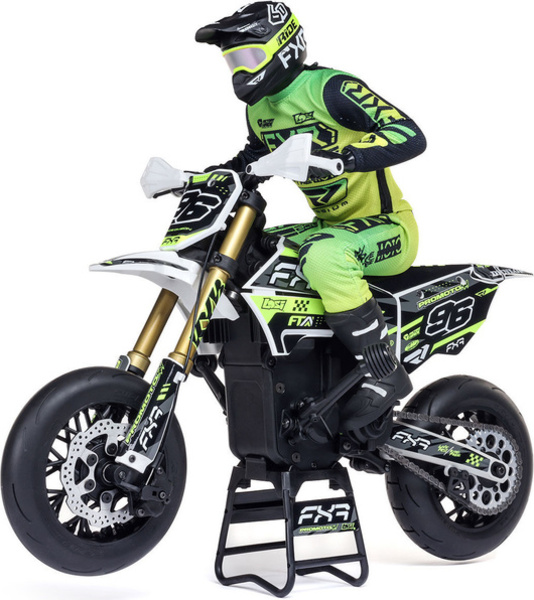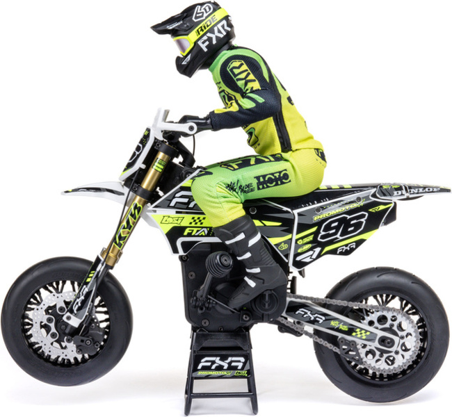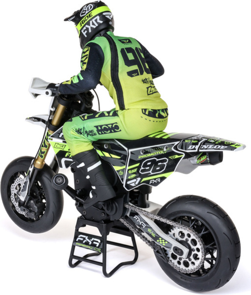 Motocicletta radiocomandata Promoto-SM sembra un vero motard. Tra i dettagli in miniatura spiccano paracolpi, parafango anteriore accorciato e grafica ufficialmente licenziata FXR con l'abbigliamento del pilota. L'aspetto in miniatura si combina con un controllo realistico tecnicamente ben gestito della motocicletta e con un'alta potenza del motore brushless. Tutto ciò grazie a un'unica combinazione di tecnologia meccanica ed elettronica, sviluppata appositamente per Losi Promoto.
