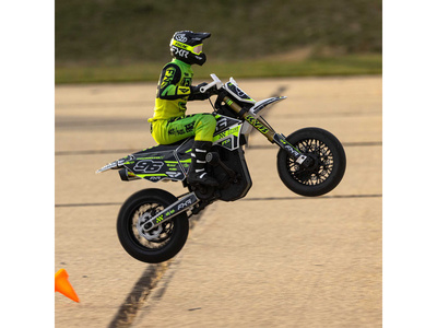 Modello RC di motocicletta Losi Promoto-SM 1:4 offre un'esperienza di guida autentica e una lavorazione dettagliata con un aspetto realistico delle moto da strada della classe Supermoto. Il Promoto-SM è particolarmente adatto per la guida su cemento, asfalto e altre superfici dure, permettendo di guidare quasi ovunque, a casa, nei parchi o nei parcheggi. Tra le principali novità rispetto al precedente modello orientato al motocross Promoto-MX ci sono i nuovi pneumatici stradali Pro-Line Racing OE (Original Equipment) SM montati su ruote più piccole, un potente pinza del freno anteriore e barre di supporto laterali riprogettate con ruote. Il Promoto-SM è più maneggevole, può inclinarsi di più e offre una migliore trazione su superfici dure.