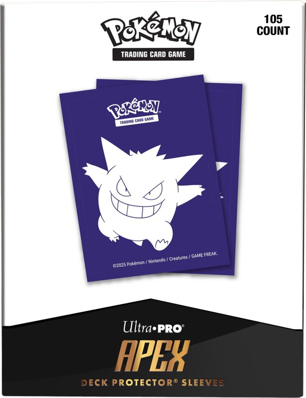 APEX custodie per carte Pokémon - Gengar. La confezione contiene 105 pezzi di custodie premium per carte realizzate con tecnologia APEX.Proteggi le tue carte preferite da danni e sporcizia. Prodotto ufficiale licenziato UltraPro realizzato con tecnologia APEX. Una tecnologia che garantisce una miscelazione più facile delle carte e una superficie piacevole al tatto.