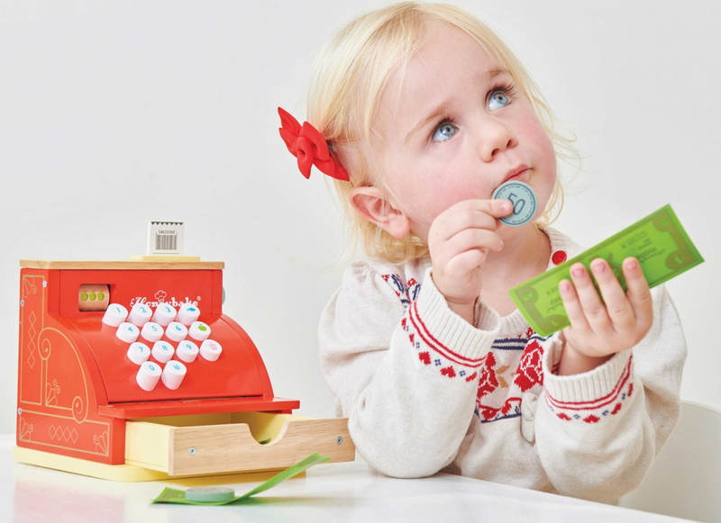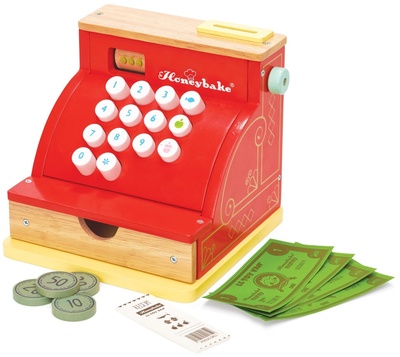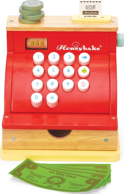 Robusto registratore di cassa in legno per bambini in stile retrò.