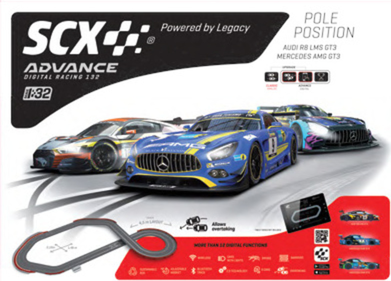 Elektrická závodná autodráha SCX Advance Pole Position 2.0 v klasickom meradle 1:32 pre napínavejšie závody - vynikajúca digitálna autodráha s možnosťou predchádzania v križovaní (ovládačom riadená výhybka), Bluetooth rovinkou pre počítanie kôl v aplikácii, mostom, zvodidlami a krajnicou s mantinelmi. Balenie obsahuje tri bezdrôtové ovládače s prepínačom výhybky, tri detailne spracované digitálne dráhové autíčka SCX Mercedes AMG GT3 Bilstein, Audi R8 LMS GT3 Marc VDS a Mercedes AMG GT3Makes & Models, ktoré sú vybavené LED svetlami. Súčasťou je tiež exkluzívne Bluetooth rovinka pre napínavé závody. Plocha pre rozloženie: 252 x 180 cm. Složenie trate je veľmi jednoduché, jednotlivé traťové diely zacvaknete do seba, spárujete ovládače s autíčkami a môžete začať závodiť.