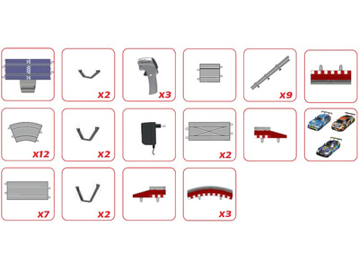 Balenie obsahuje traťové diely, most, 2x križovanie, zvodidla, krajnice s mantinelmi, Bluetooth napájaciu rovinku, 3x dráhové autíčko, 3x ovládač a napájací zdroj. Návod SK.