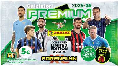 Carte da collezione SERIE A 2025/2026 ADRENALYN - PACCHETTO PREMIUM. Il pacchetto contiene 11 carte: 5 carte base + 4 carte speciali + 1 carta limitata + 1 carta ADREINROT.