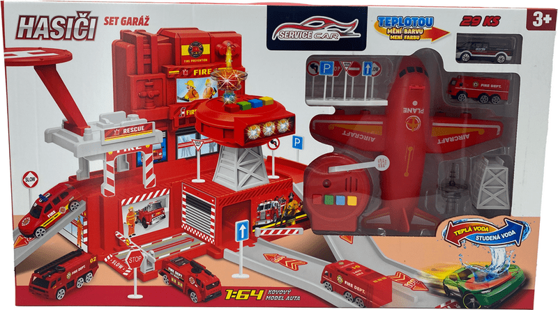 Set di pompieri garage con auto che cambia colore
