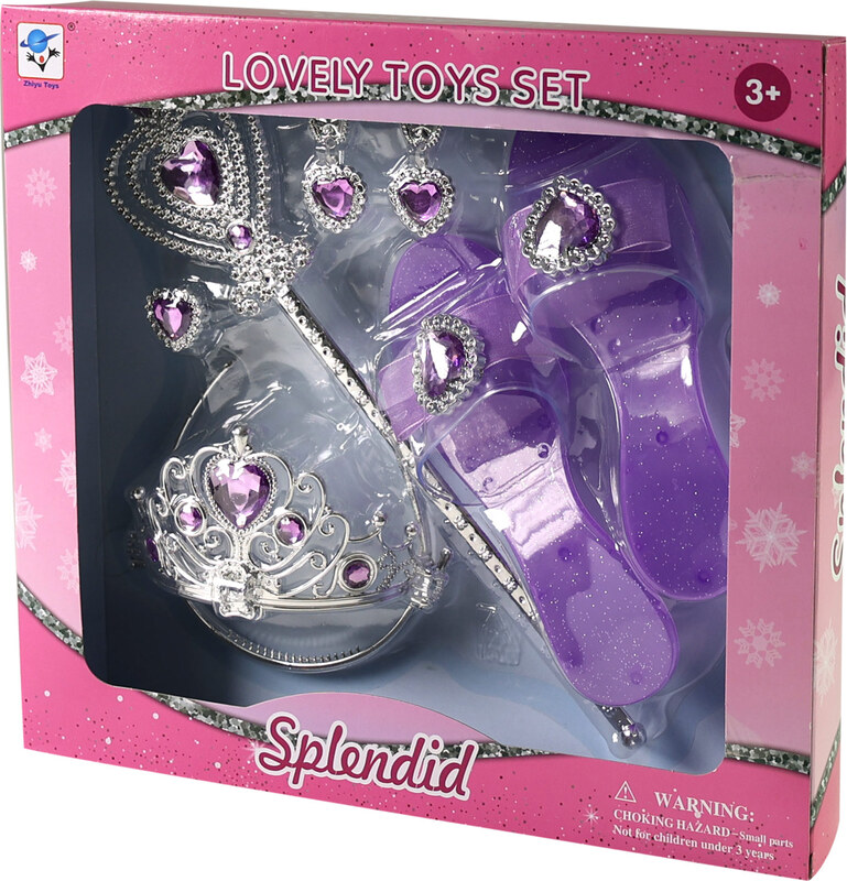 Trasformati in una vera principessa! Questo bellissimo set contiene tutto ciò di cui una piccola diva ha bisogno per le sue avventure da favola.Eleganti scarpette, corona, orecchini, anello e bacchetta magica. Grazie alla combinazione di colori argento e viola, l'intero set appare molto festoso e affascinante.