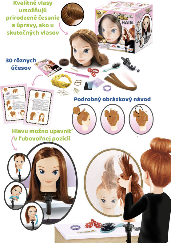 Il salone da parrucchiere professionale offre una qualità superiore, grazie alla quale il giocattolo diventa uno strumento pratico che le ragazze possono utilizzare per apprendere le basi degli stili di acconciatura e successivamente utilizzarlo per sistemare i propri capelli. A tal fine, il set include decine di accessori (ferretti, cerchietti, spazzola, pettine, ecc.) e un manuale illustrato con la descrizione di 30 acconciature diverse e la traduzione in slovacco.