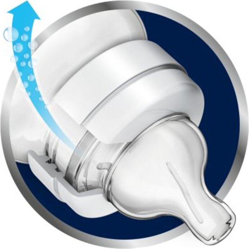 Il ciuccio in silicone AVENT ha un bordo brevettato unico che funge da valvola unidirezionale. Il ciuccio permette all'aria di fluire nel biberon durante la poppata, prevenendo così la formazione del vuoto nel biberon. Il bambino non deve lasciare il ciuccio durante l'allattamento e può bere continuamente come durante l'allattamento al seno senza inghiottire aria. Un suono scintillante è un segno che l'aria sta fluendo nella bottiglia e non nello stomaco del tuo bambino. L'aria appena ingerita durante l'alimentazione provoca il pianto causato da coliche dolorose o gonfiore.