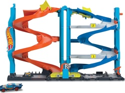 Partecipa a gare epiche in Hot Wheels ™ City Racing Tower. L'innovativo set di gioco si trasforma da piste affiancate con cancelli di partenza equi a un unico binario alto oltre 66 cm.