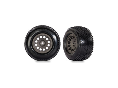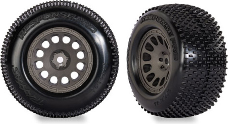 Ruote complete per auto RC Traxxas Mini XRT. Cerchio grigio angolare con pneumatici Response Pro (mescola morbida S1) con inserto in schiuma. Diametro del cerchio 2.1" (esterno) / 2.6" (interno).